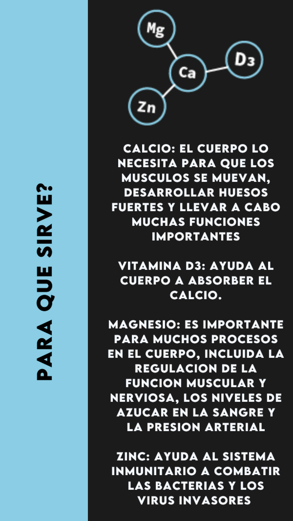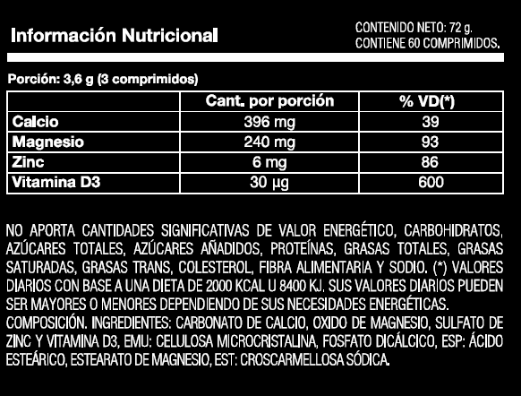 Este suplemento contiene una combinación balanceada de calcio comprimido, zinc y vitamina D3, nutrientes esenciales para mantener la salud ósea y favorecer la absorción eficiente del calcio. Cada frasco incluye 60 comprimidos, pensados para acompañar tu rutina diaria con comodidad y eficacia.